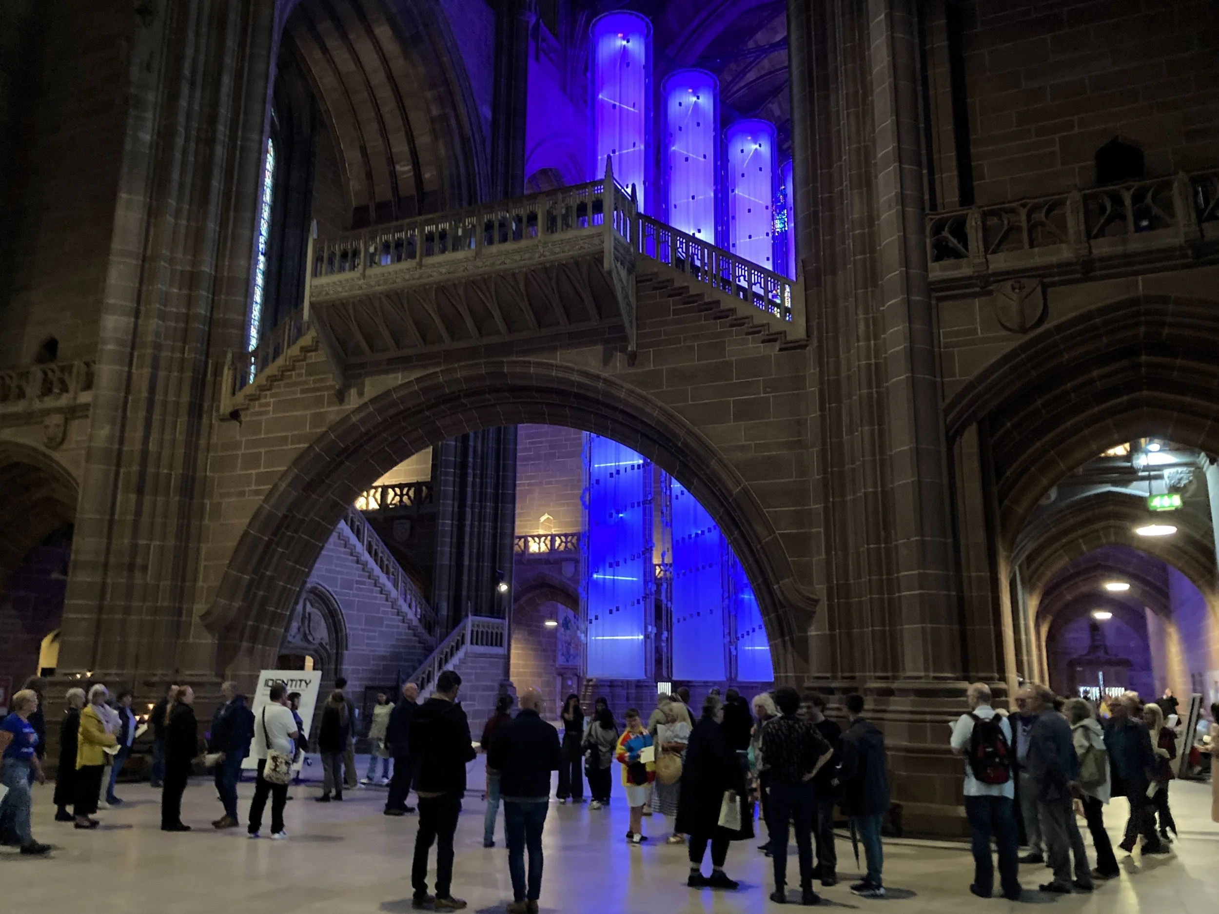 She also drew our attention to the current art installation inside the Cathedral, IDENTITY by Peter Walker – seven columns, with individual strips of light representing the double helix of DNA and demonstrating the unique make-up of each person. Together, the seven columns represent our distinct differences, gathered in union. The columns are wrapped in over 3000 individual portraits of people from the city, photographed as part of Peter Walker’s 2022 installation Being Human. The illuminated columns change colour, representing our shared values as well as individuality, including our ethnicity, gender and sexuality.